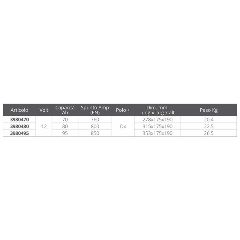 Batteria per avviamento e servizi di bordo, resistenza al ciclaggio dalle 3 alle 4 volte superiore rispetto alle tradizionali batterie ad acido libero, uso combinato, ideale per avviamento e servizi, manutenzione zero e a prova di fuoriuscite. Autoscarica minima ideale per un utilizzo stagionale. Elevata stabilità meccanica grazie alla tecnologia AGM per una maggiore resistenza a scosse e vibrazioni. Massima sicurezza d’uso grazie alle valvole di sicurezza. Bassa resistenza interna grazie ai separatori in fibra di vetro per un’accettazione di carica e un’erogazione di corrente ottimizzate. Capacità : 70Ah. Spunto: 760 Amp. Dim. mm. 278x175x190