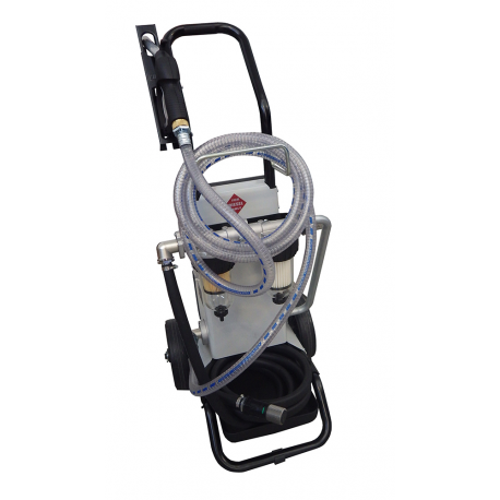 Cleaning mobile unit to clean the diesel fuel, tanks and water separation. The condensation which forms inside the tanks because the proliferation of bacteria which causes the deterioration of the diesel fuel and the oxidation of the tanks. This system allows washing of the tanks without having to disembark them and the purification of fuel. Complete with two flexible hoses for fuel inlet and outlet, one with a valve Ø mm.51 for the inspection holes, the other with a more rigid tube with Ø 20 mm for smaller accesses. Double filtering body, the first filter Water Captor of 30 micron with water absorption has the capacity of 50 lt/min, The second filter Clear Captor of 5 microns for impurities and suspended materials has the capacity of 100 lt/min. Both areequipped with a drain to empty the water and impurities. Control panel with ON-OFF switch, pressure gauge and overpressure nozzle valve.