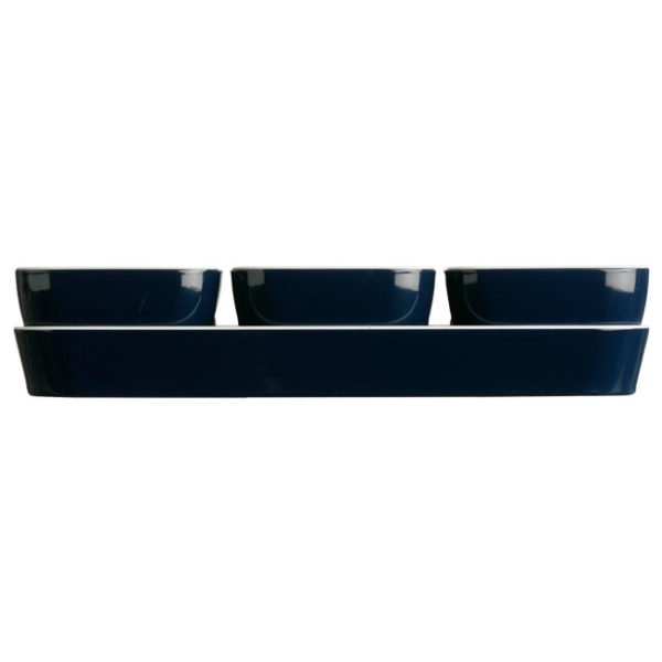 The practical REGATA snacks set contains 4 pieces ( a tray and three bowls) made from two-tone blue and white unbreakable melamine.