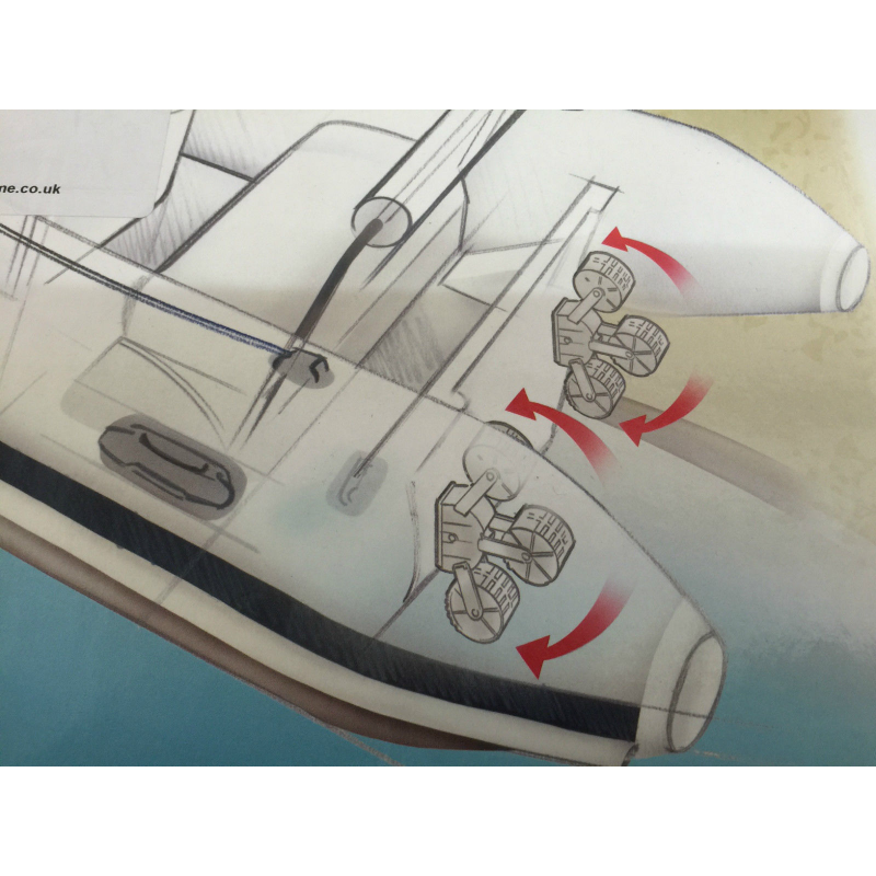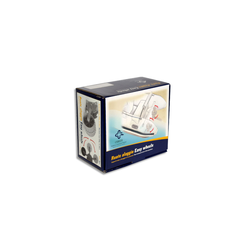 Rrota të palosshme për transportimin dhe nisjen e gomoneve pneumatike, anijeve prej alumini dhe tekstil me fije qelqi. Bërë nga materiali plastik, kapaciteti maksimal i motorit i përfshirë kg.110. Montimi i traversës. Lartësia 300 mm, Ø rrotat 135 mm