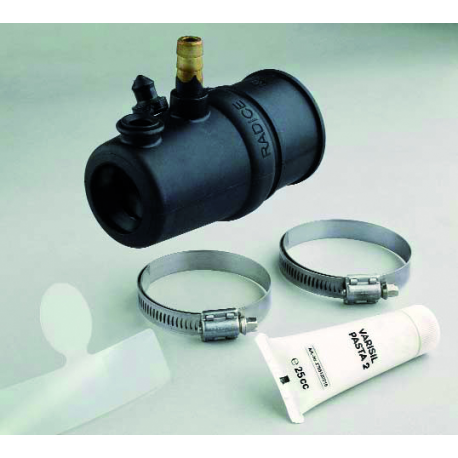 RMTA axial seal in self-extinguishing “CR” elastomeric rubber, for metric propeller shafts, replaces the traditional braid press. Small in size and easy to assemble. Complete with brass hose connector for hydrolubrication, hole with closing cap to screw the tube of special silicone grease and thus facilitate its insertion into the seal, stainless steel clamps, and protective plastic ring for mounting the shaft.