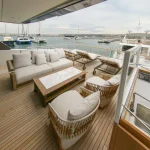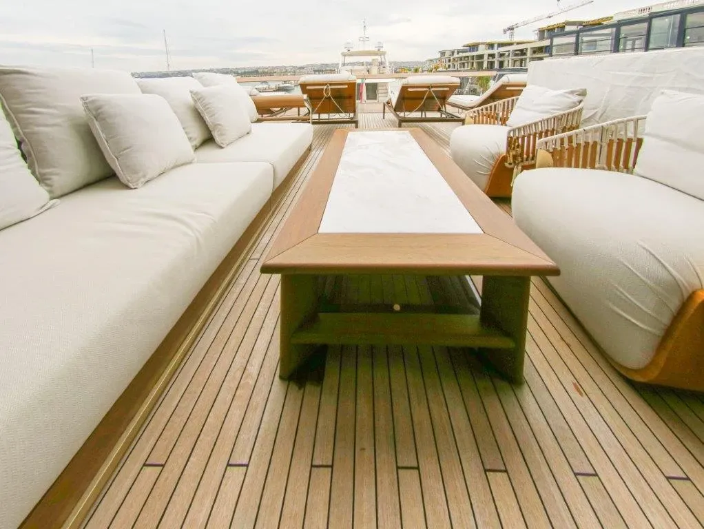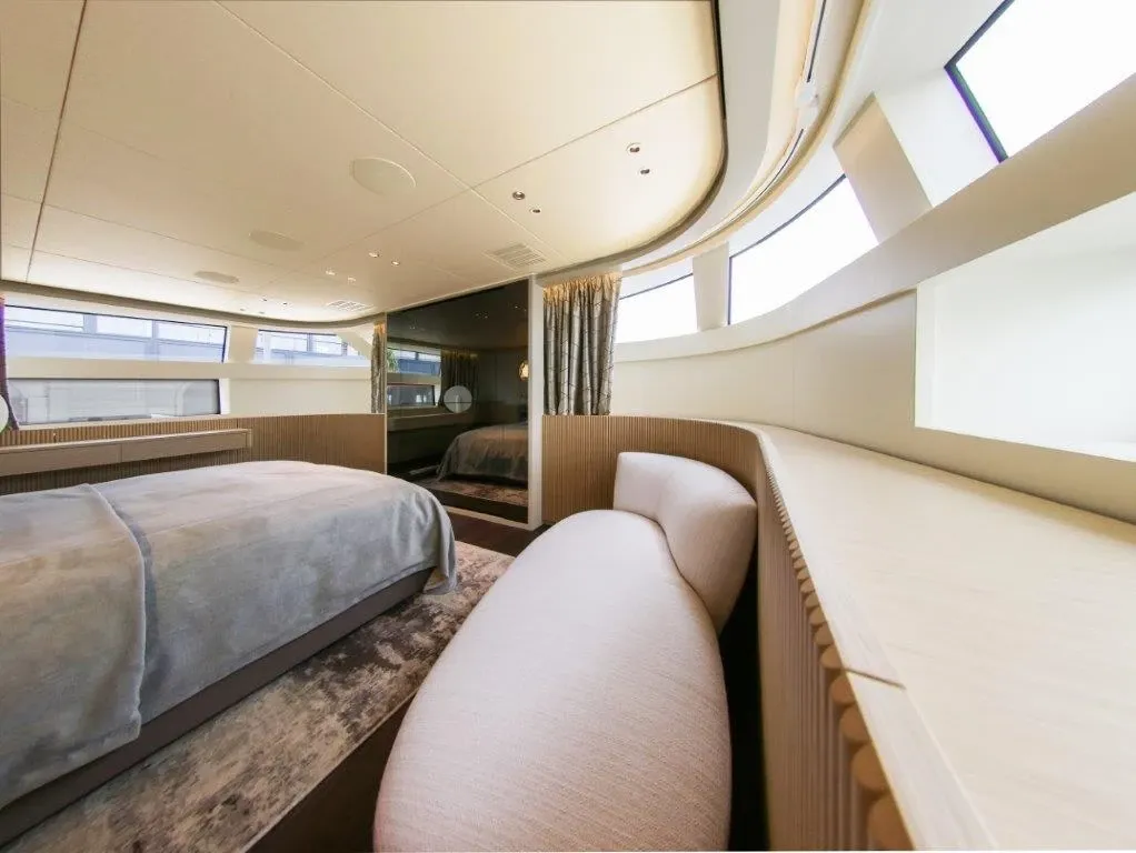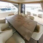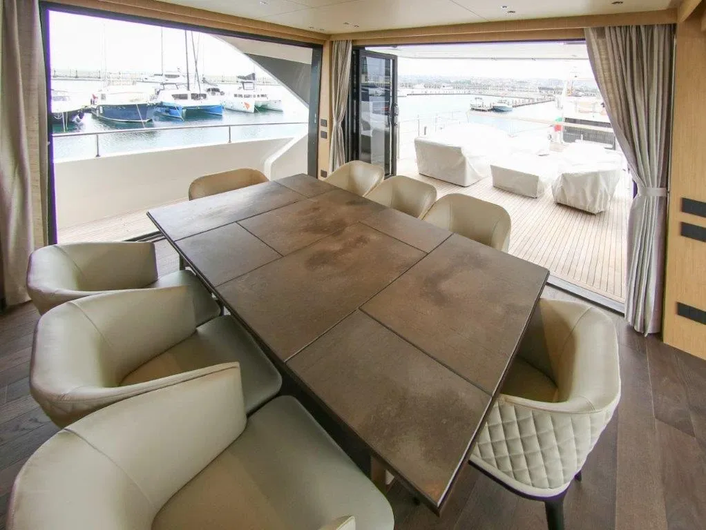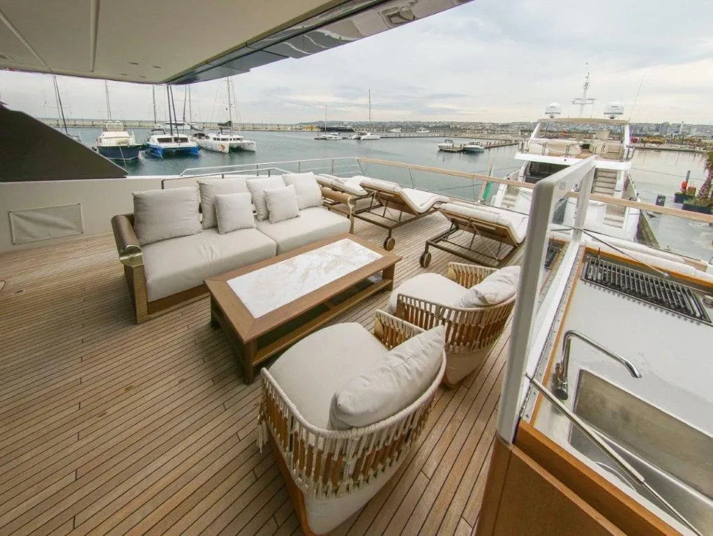- Deck Spaces: Large flybridge with bar, BBQ, and dining; spacious aft cockpit lounge.