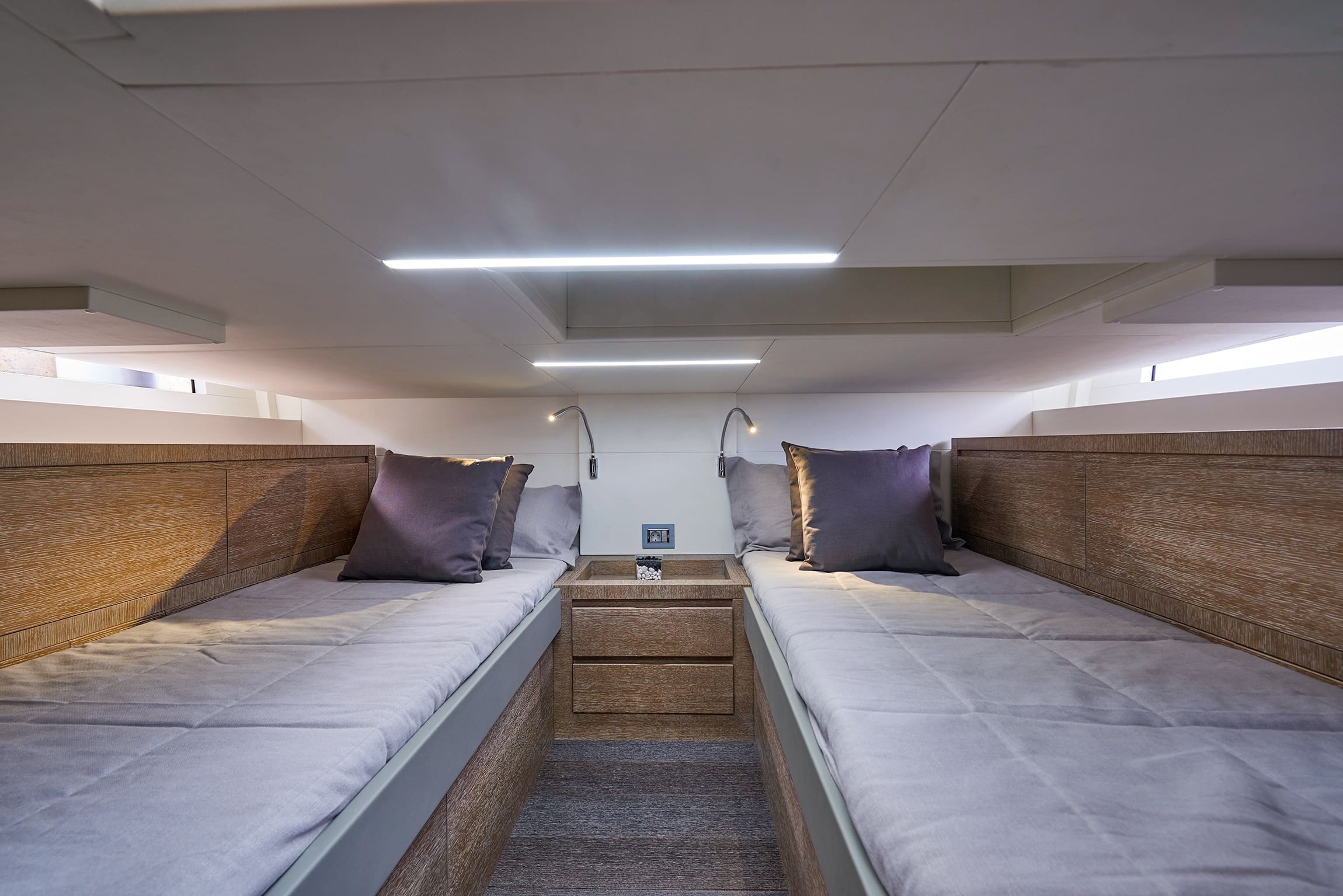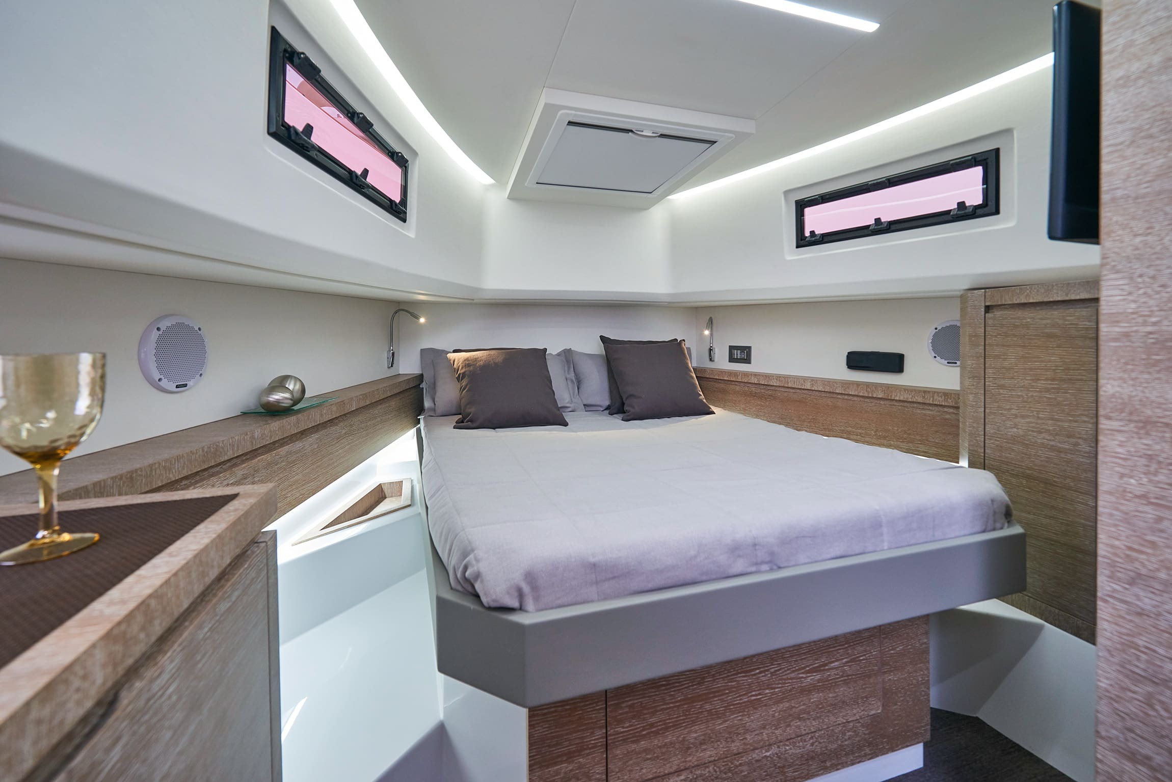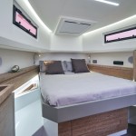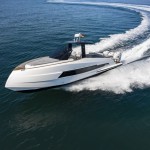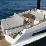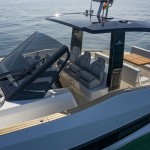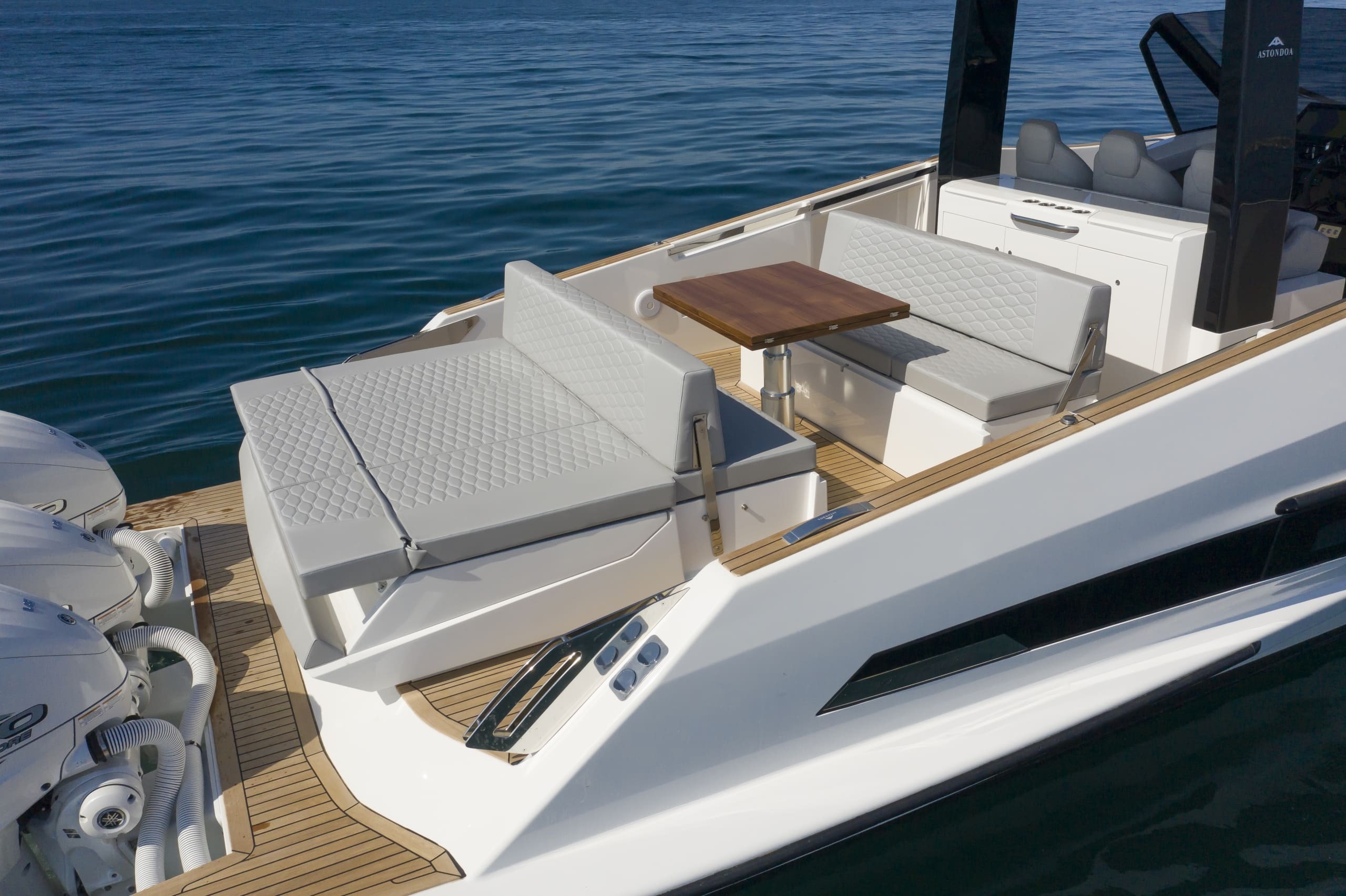 This meter ( ) sportsboat features the same GRP planing hull and bold, clean lines as the standard Coupe, but its transom is optimized to carry powerful outboard engines. This shift in propulsion frees up the internal engine bay, which is converted into a vast, flexible storage and leisure area beneath the aft sunpad, perfect for housing water toys or additional gear. The deck remains a fully functional walk-around design with a triple-seat helm protected by a rigid T-Top, an outdoor wet bar/galley, and a convertible dinette/sun lounge in the cockpit. Below deck, the interior is identical, featuring a luxurious master cabin, a separate guest cabin (accommodating four total guests for overnight stays), and a generous head with a separate shower, all finished to Astondoa’s high yacht-quality standards.