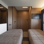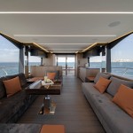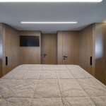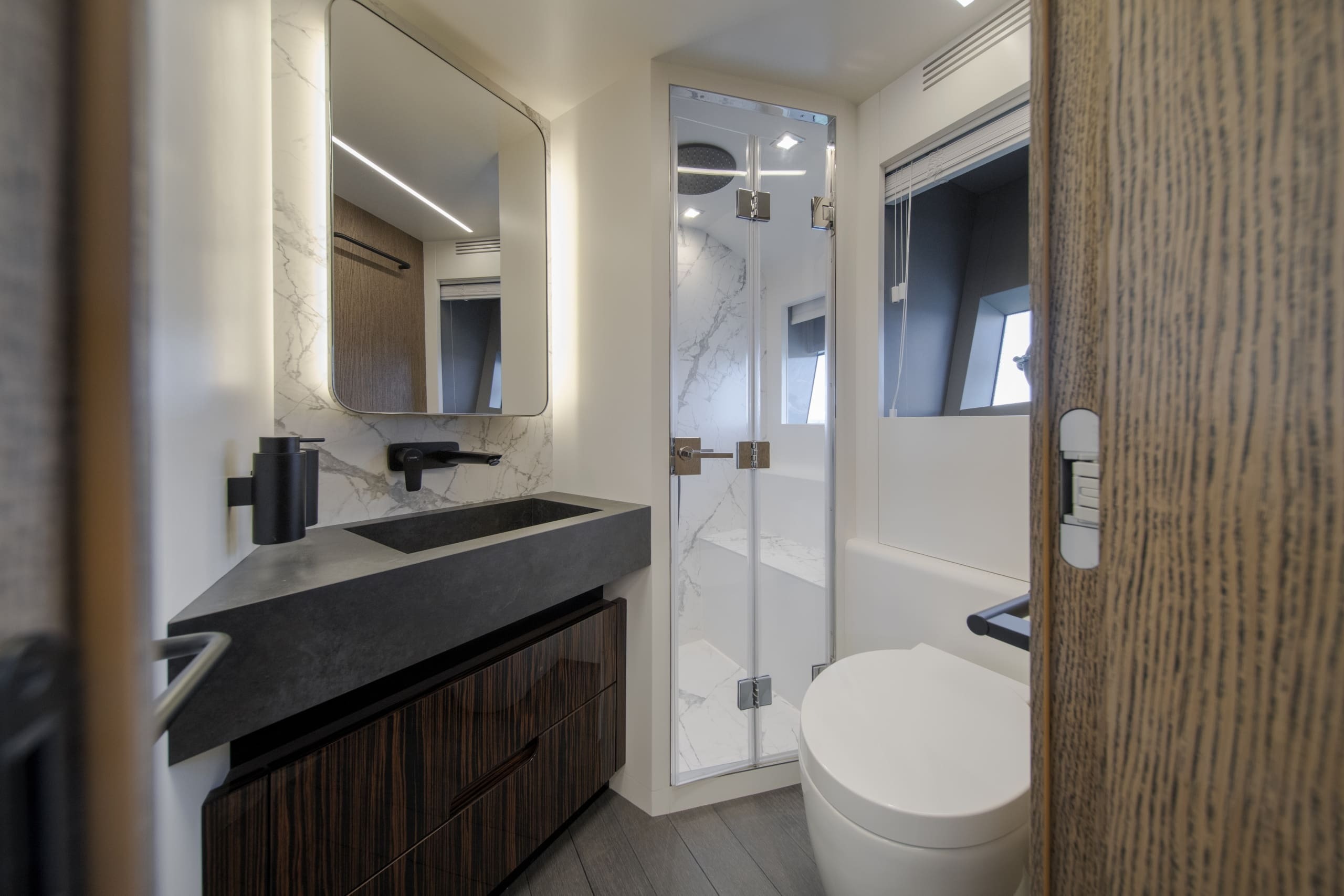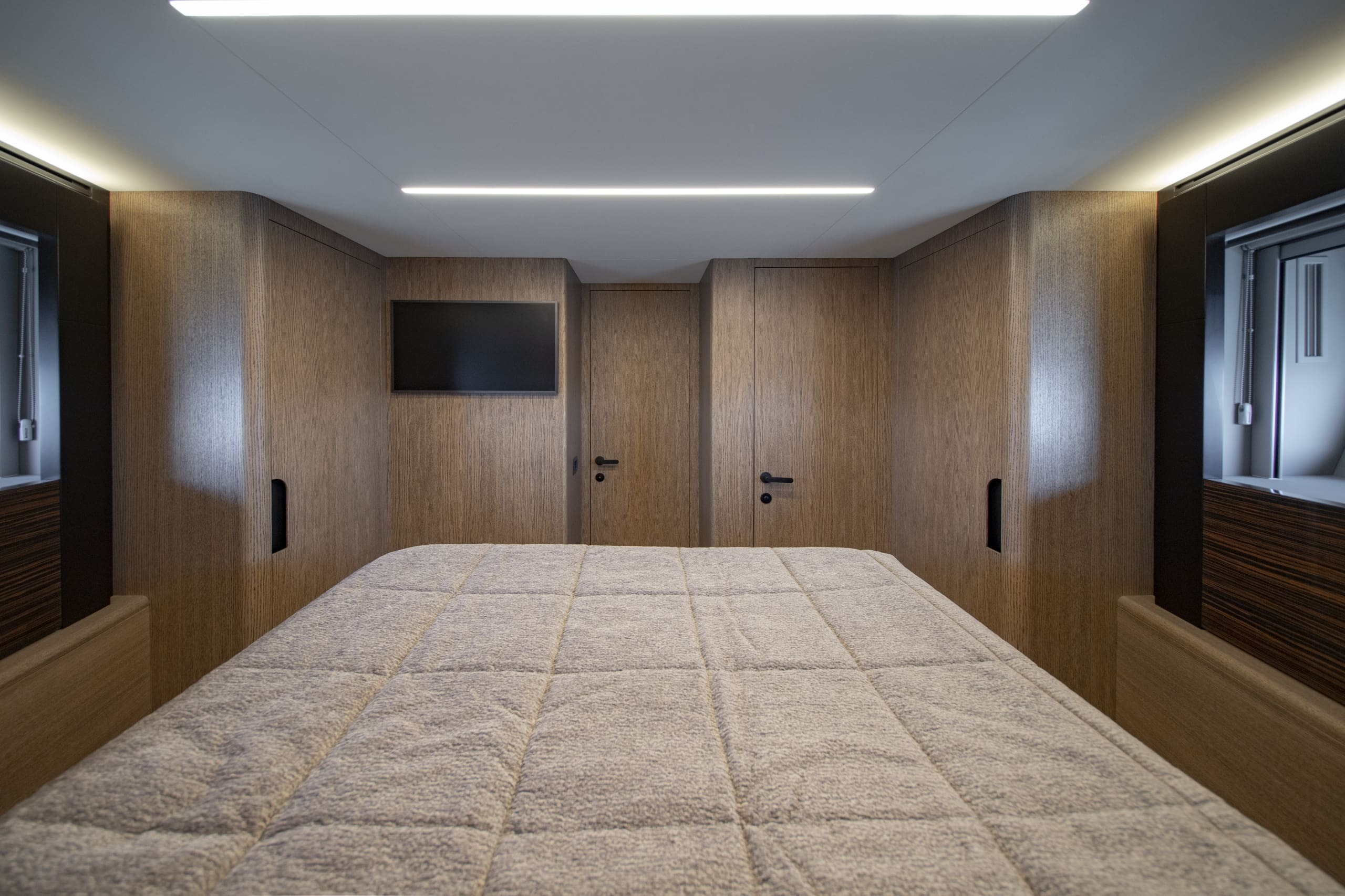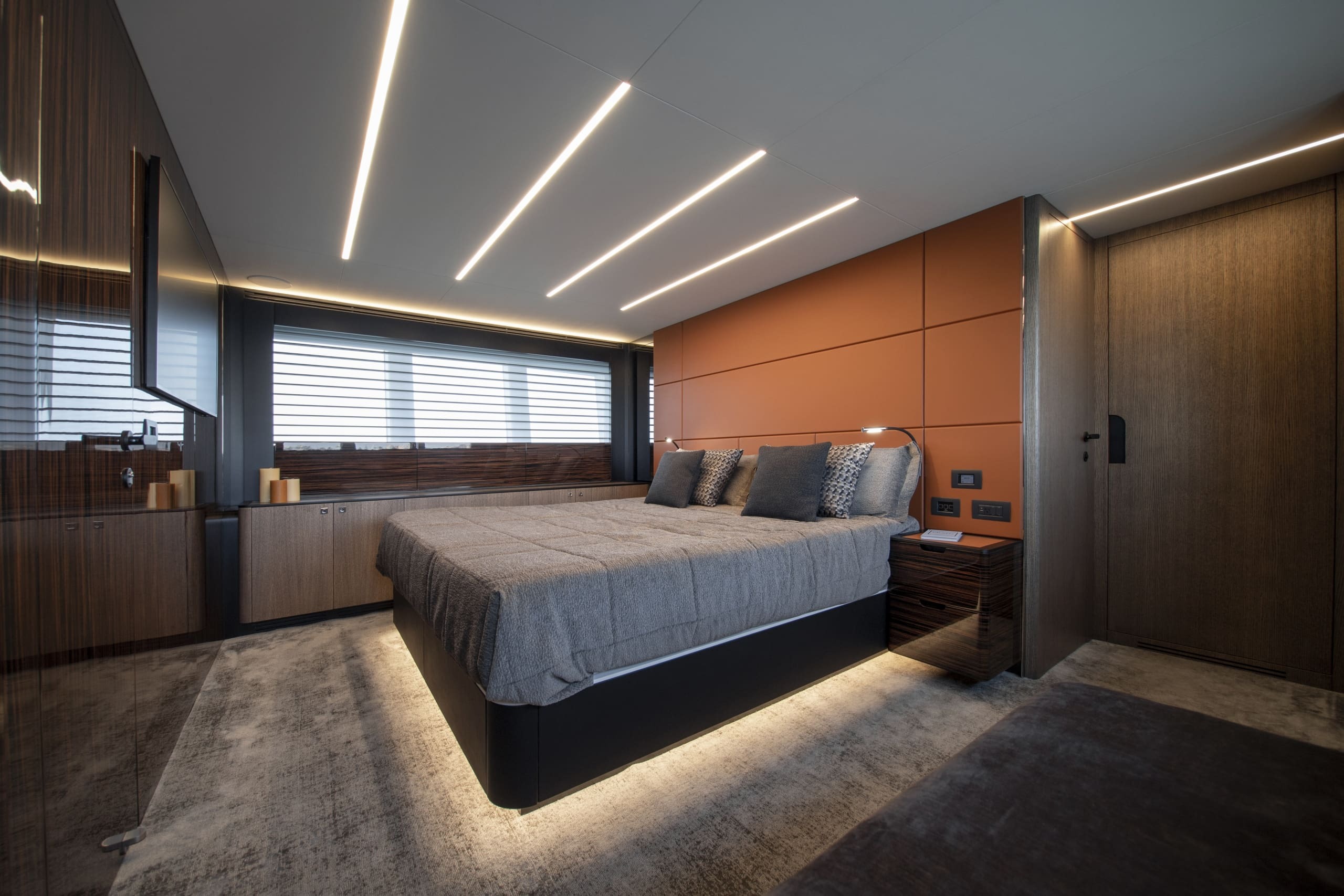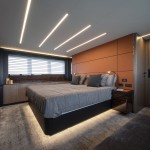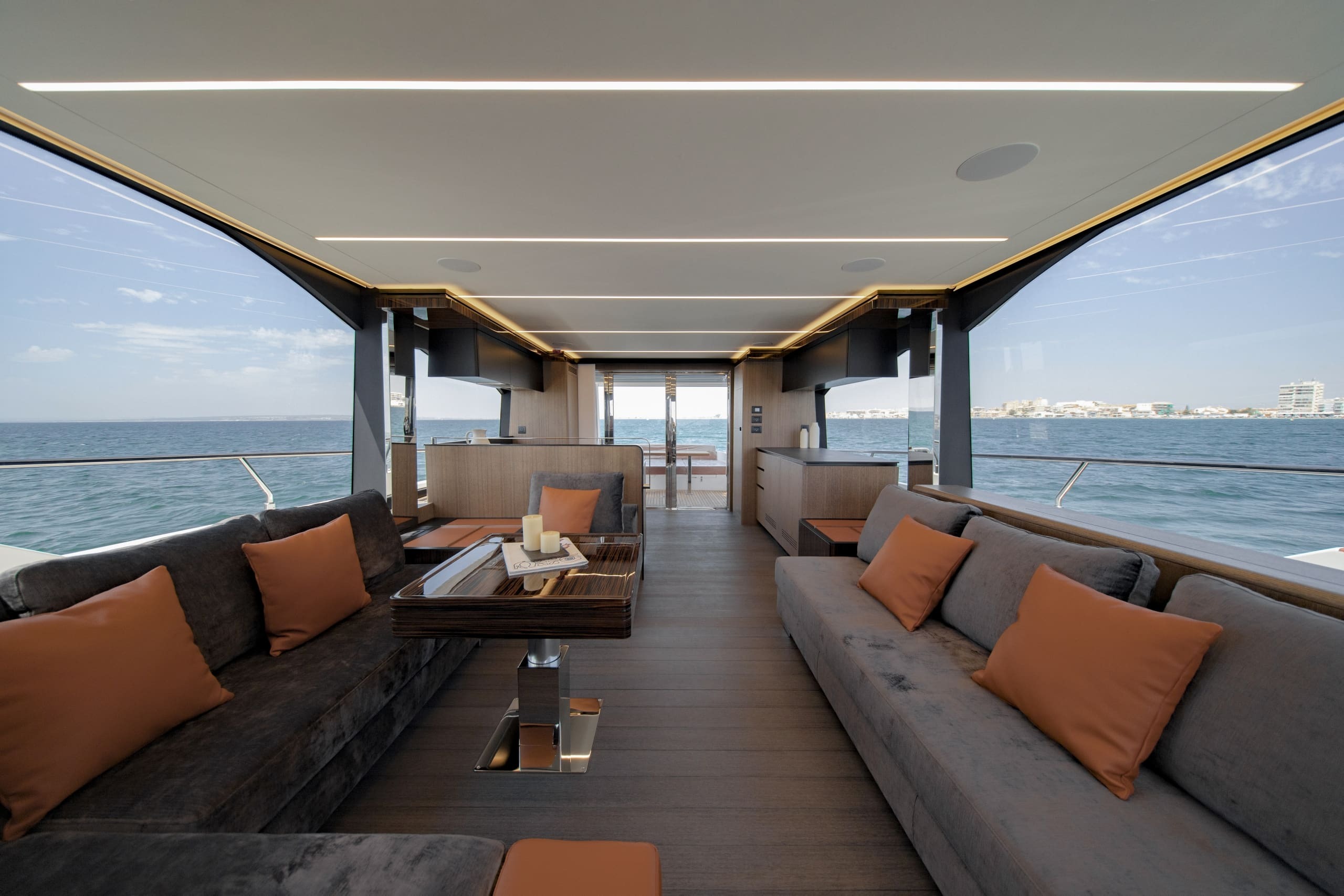 The meter ( ) 66 Flybridge utilizes a GRP planing hull, achieving speeds up to knots. Its defining feature is the sense of volume created by ample freeboard and large, continuous hull windows, which flood the lower-deck cabins with natural light. The flybridge itself is a major social hub, protected by a stylish hardtop and featuring a complete wet bar, large dining area, and flexible sunbathing space. On the main deck, the saloon and galley are designed with a single-level, step-free layout, enhancing the feeling of openness. Accommodation below deck is exceptional for its size, with the standard layout providing four staterooms. The full-beam, amidships master suite is a standout, offering impressive space and luxury.