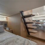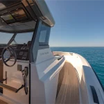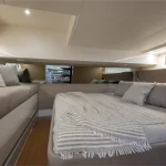 This meter ( ) yacht is built on a deep-V planing hull engineered by Lou Codega, ensuring stability and a smooth ride even in choppy seas. Its hallmark feature is the full walk-around deck protected by high, solid bulwarks, maximizing safe and usable exterior space from stern to bow. The helm station is centrally positioned with a distinctive reverse windshield for excellent visibility and reduced glare. Below deck, the layout makes brilliant use of the -meter beam: it features a spacious, full-beam owner’s cabin amidships with a king-size bed and a generous bathroom with a separate shower. The forward area is configured as a convertible dinette that can sleep an additional two people, making it highly versatile for weekend cruising.