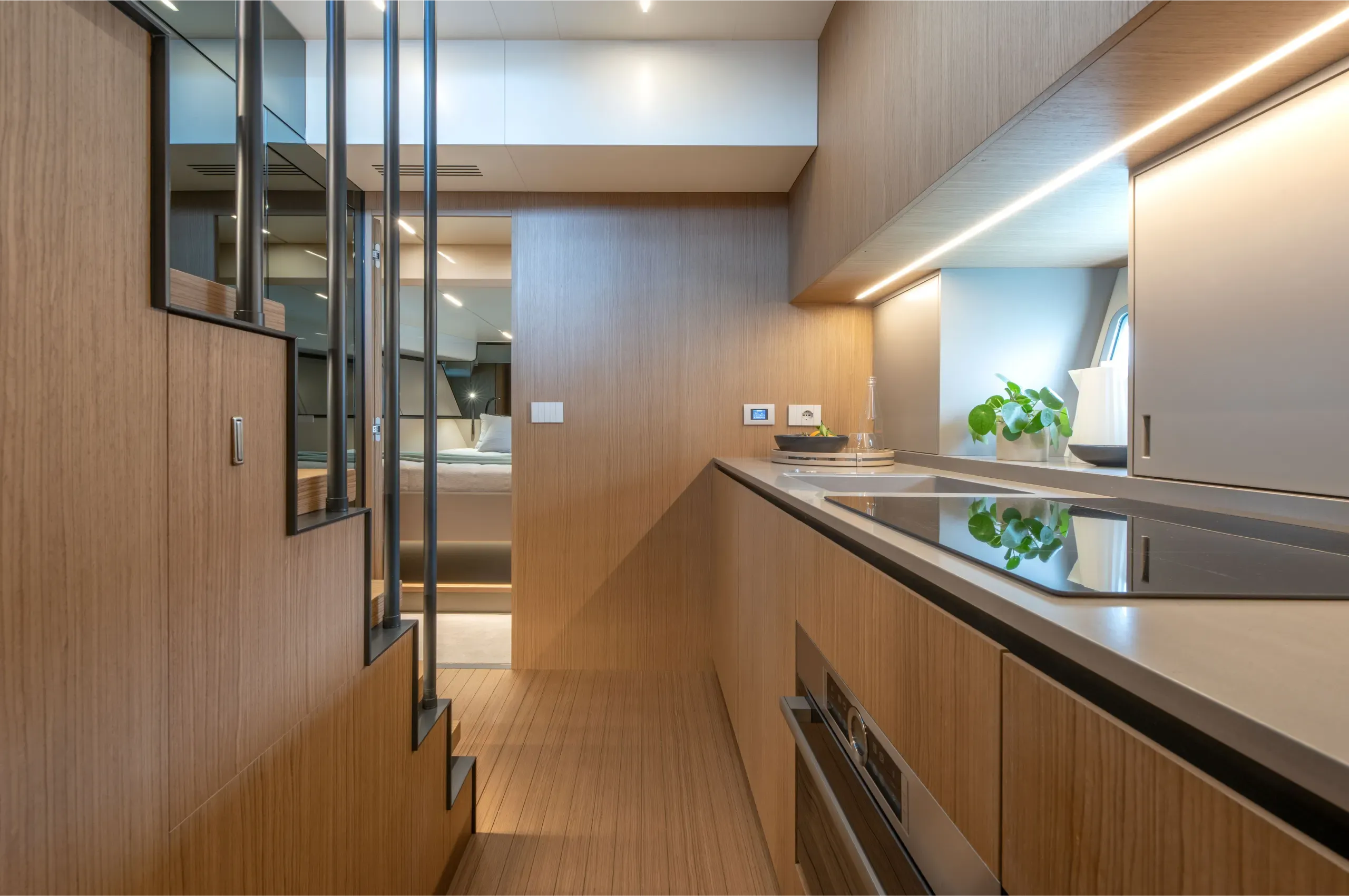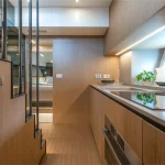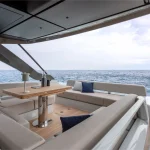 This meter ( ) yacht is built on a performance planing hull designed by Lou Codega and is powered exclusively by the efficient, maneuverable Volvo Penta IPS pod system. Its exterior is characterized by a full walk-around deck protected by high bulwarks, and a highly versatile stern featuring a hydraulic platform that can launch a tender or transform into an immersed beach club. The main deck maximizes socialization: the helm features a distinctive reverse windshield for superb visibility, and a strategically placed aft galley ensures the chef is integrated into the cockpit’s large social area. Below deck, the efficient IPS propulsion allows for a flexible layout offering two or three cabins, including a luminous, full-beam master suite amidships—a rare luxury for a yacht of this size.