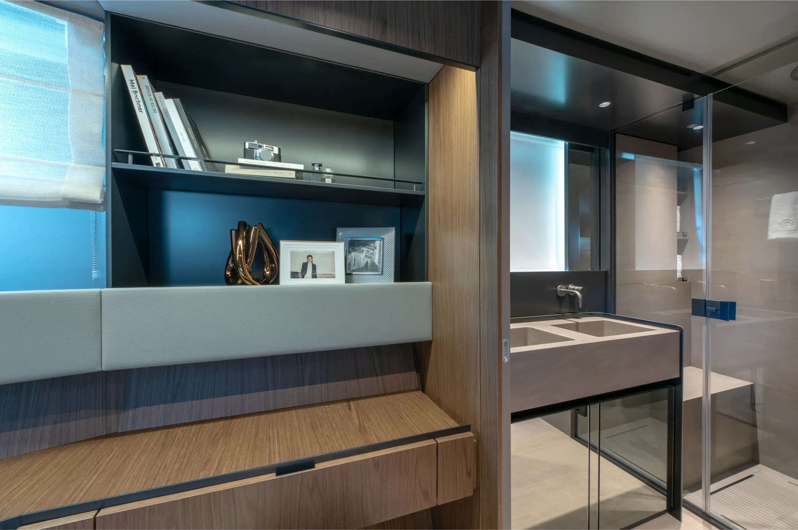 This meter ( ) yacht is built on a high-performance planing hull designed by renowned naval architect Lou Codega. Its exterior is characterized by an unconventional layout that maximizes the connection with the sea: the main living areas are distributed over three levels, including a large aft beach area directly connected to the water. The cockpit offers visibility with a distinctive inverted glass windshield, which can be totally enclosed for protection or privacy. The innovative interior layout places the main salon and aft galley on the lower deck, accessing the beach area via large sliding doors, borrowing a successful concept from the BGX range. Guest accommodation features three customizable cabins, including a large master suite, providing luxurious space and light below deck.
