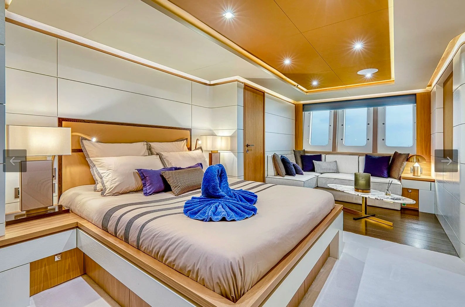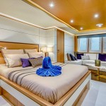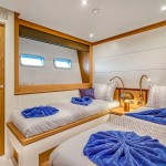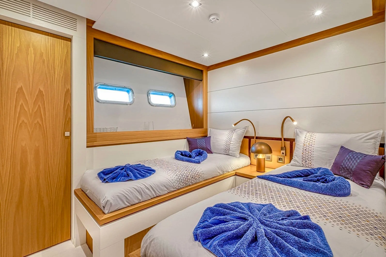 - Cabins: 5 staterooms (Full-beam Master Suite on Main Deck + 2 Double Cabins, 2 Twin Cabins on Lower Deck), all en-suite.