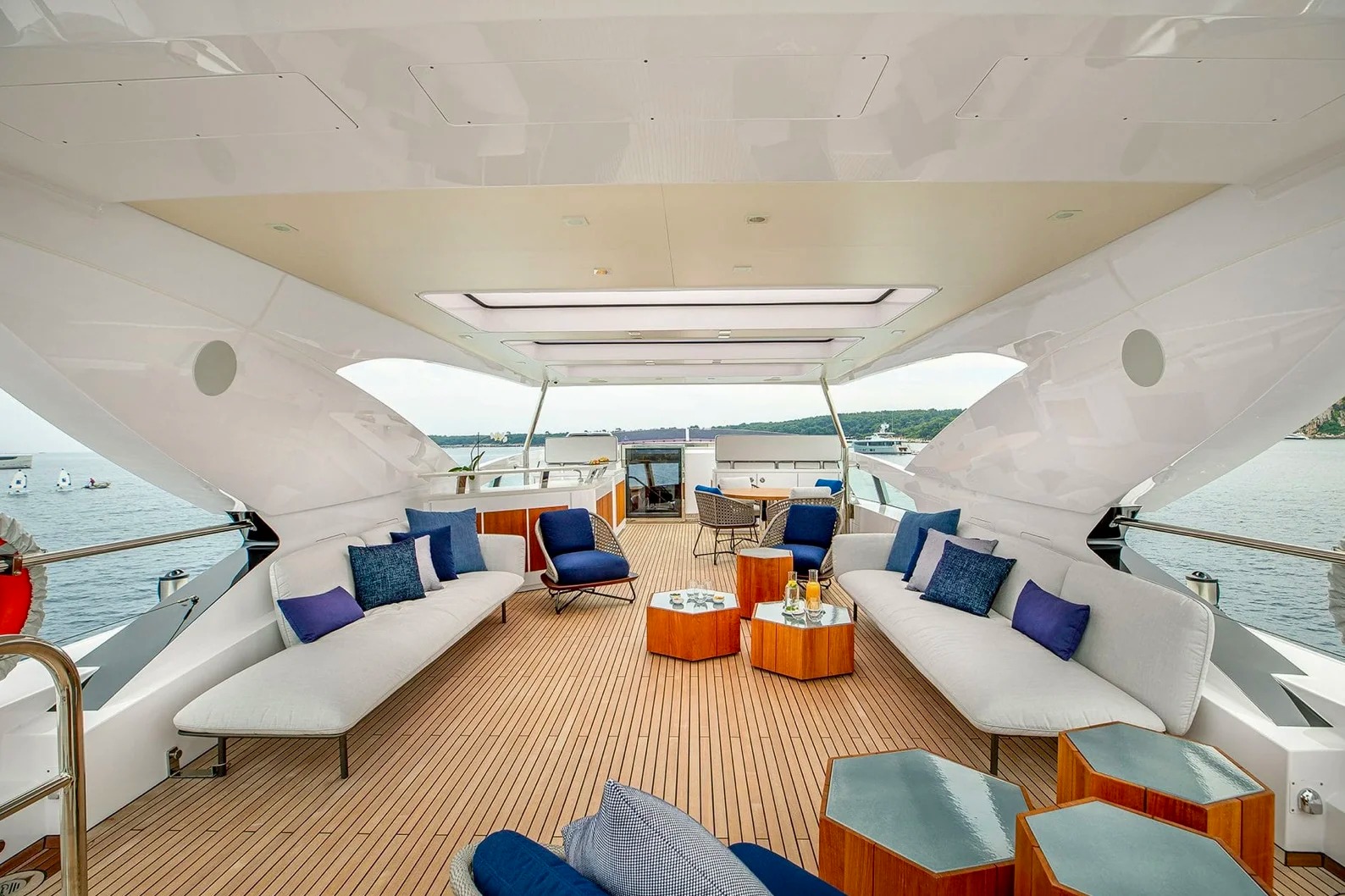 The Couach 3700 FLY is a meter ( ) tri-deck motor yacht built with a Kevlar composite hull and GRP superstructure, maximizing strength and reducing weight for performance. With an internal volume of Gross Tonnage (GT), the yacht feels significantly larger than its size suggests. The design is sleek and contemporary, featuring spacious indoor/outdoor social areas. A key selling point for charter is the versatile layout, which accommodates five en-suite cabins, including a desirable Master Suite on the Main Deck forward. The Sun Deck is the ultimate chill-out zone, often featuring a large Jacuzzi and full wet bar.