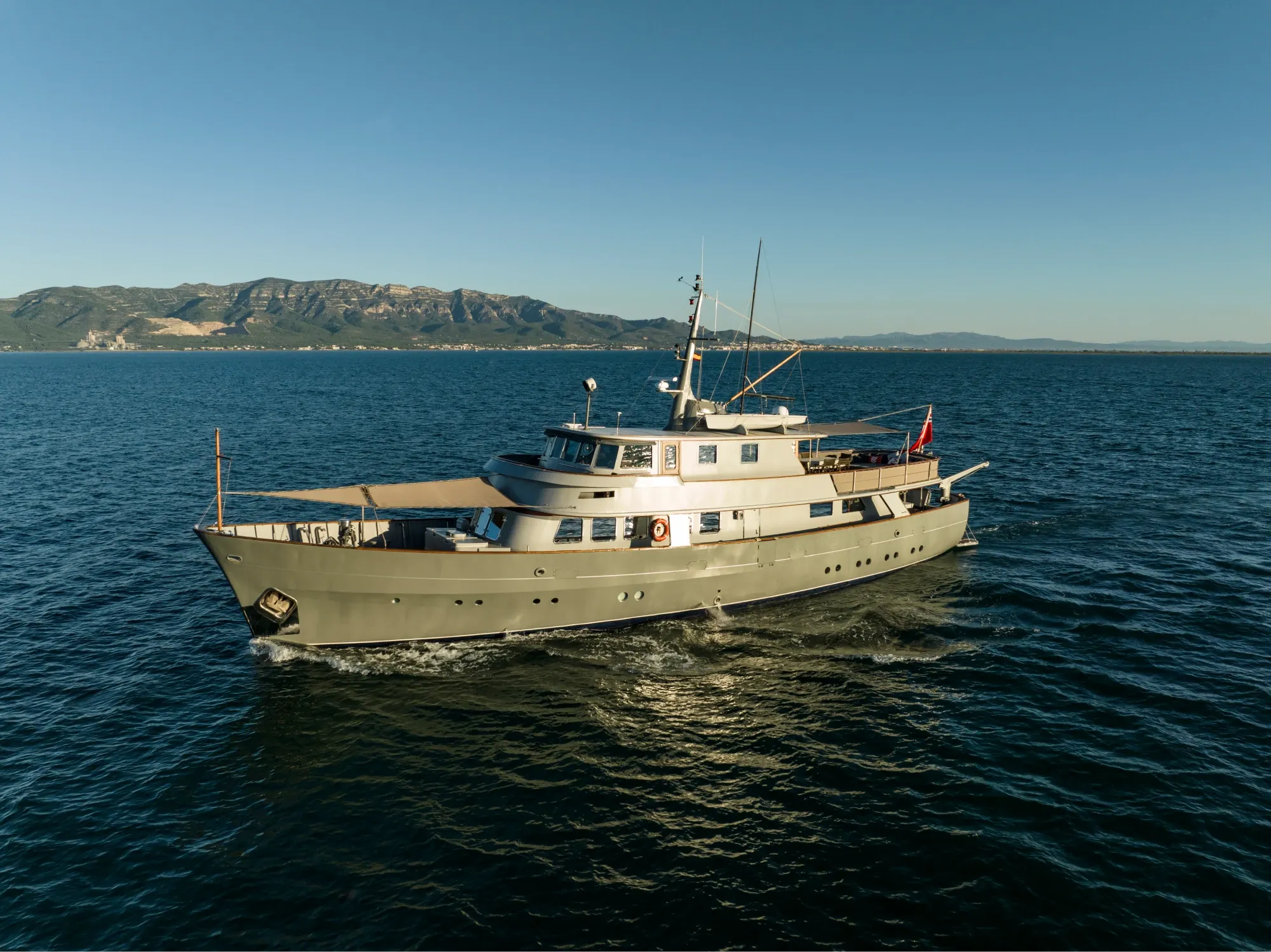 Charter the historic Custom Motorsailer 29m for an exclusive journey blending rich heritage with understated luxury. This fully rebuilt yacht delivers incredible self-sufficiency with a proven 3,360 nautical mile range and a comfortable cruising speed of 10 knots. The interior, styled by design icon Christian Liaigre, features timeless elegance with dark woods and leather accents. Guests will enjoy four luxurious cabins for nine people and benefit from the convenience of an included Axopar 37 Chase Boat for fast excursions. Unique in its ability to host up to 35 guests for dockside events, this stable, steel-hulled vessel offers a luxurious, adventurous, and truly unique charter experience in the Mediterranean.