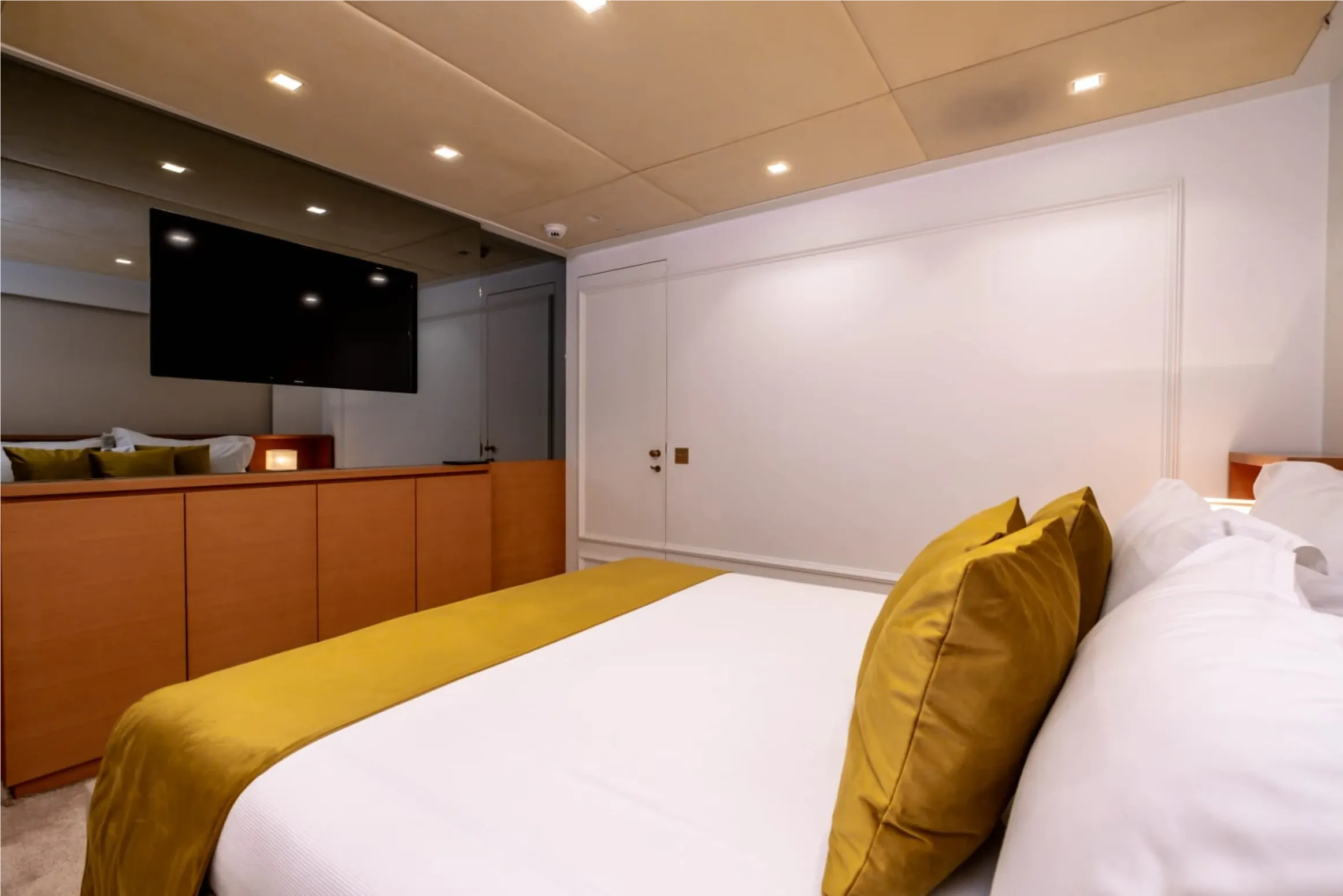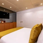 - Cabins: 5 staterooms (Main Deck Master Suite with private access to foredeck + 1 VIP, 2 Double, 1 Twin Cabin), all en-suite.