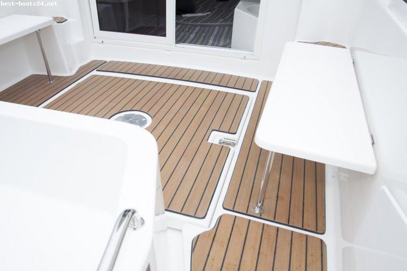 for sport fishing and with the family. Among its merits it boasts a modern design, fine finishes, robustness of a stable hull capable of guaranteeing excellent seaworthiness. Excellent distribution of spaces with comfortable bow sundeck. Large cockpit with lowerable seats. Unique interiors for boats of this category where it is possible to accommodate a marine bathroom even with a separate room and 2 + 2 beds.