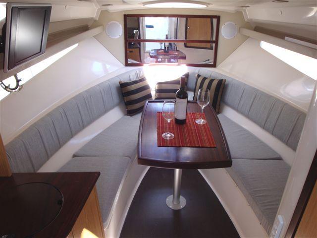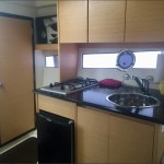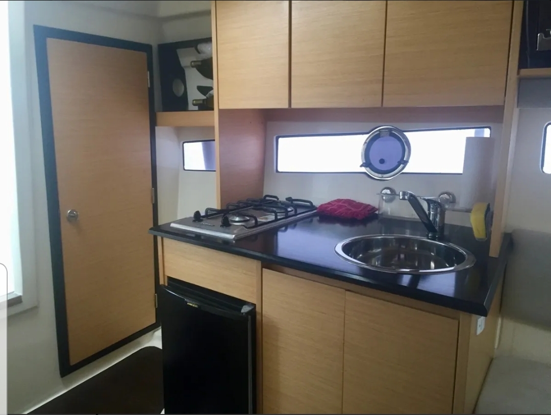 The interior is extraordinarily welcoming, built with top quality materials, with a large aft cabin, equipped with a door for greater privacy, a galley equipped with stove, sink and refrigerator and finally a bathroom with electric toilet.