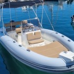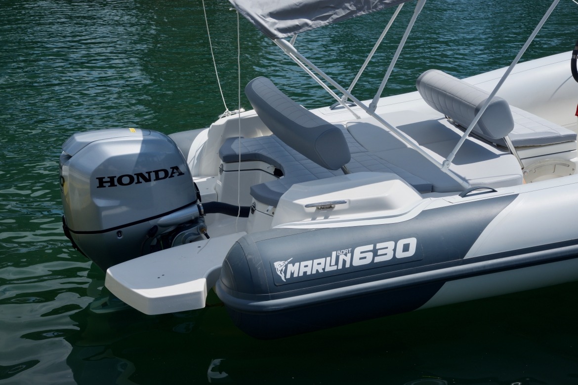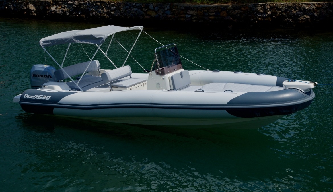 The Marlin 630 DYNAMIC is a highly capable 6.30 meter (20′ 9”) open RIB. It is built with a reinforced GRP Triple Hull Moulding structure and durable Hypalon-Neoprene tubes, ensuring excellent structural integrity and stability. This boat is designed to be compact yet stable, able to carry up to 10 people. Propulsion accepts a maximum power of 150 HP, delivering excellent performance, reliable handling, and a top speed around 30 knots. The layout is functional, featuring a central console and maximizing deck space for seating and sunbathing.