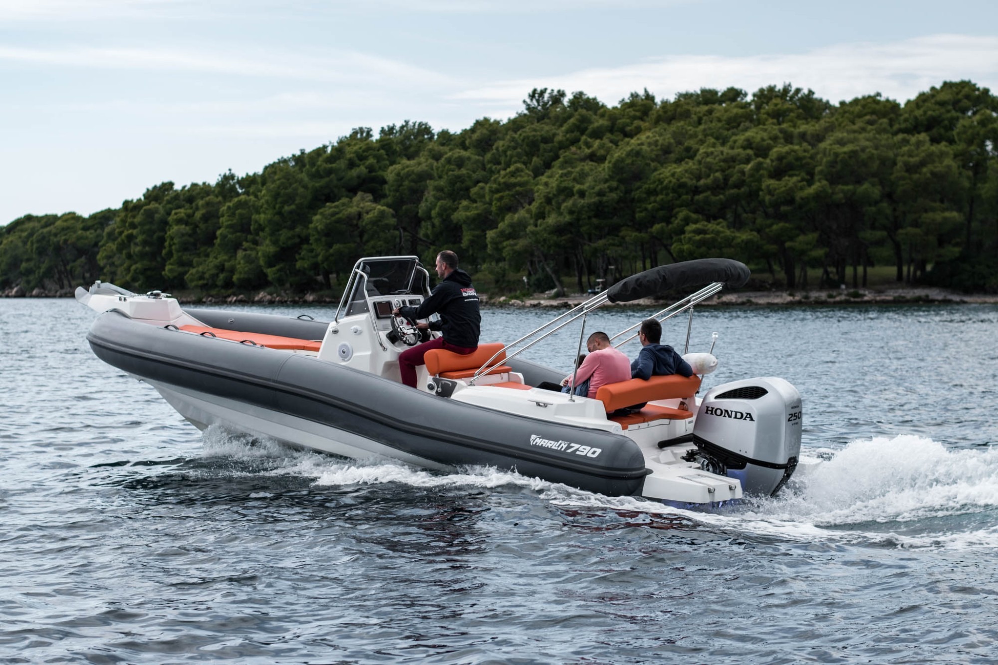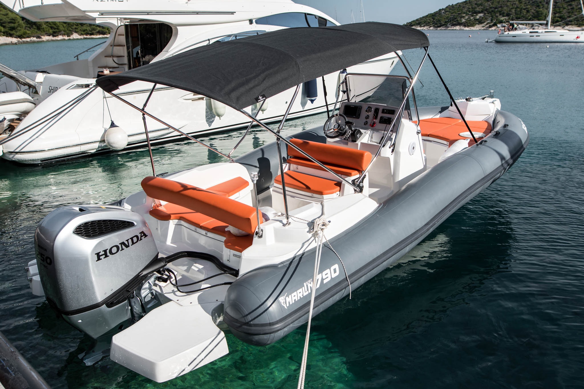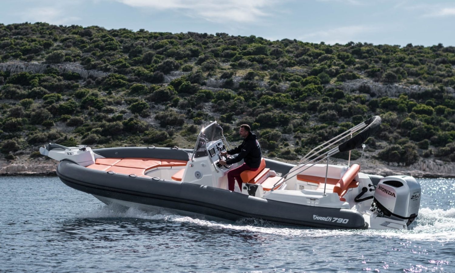 The Marlin 790 DYNAMIC is a popular and highly capable Rigid Inflatable Boat (RIB) from the Italian shipyard Marlin Boat, specifically positioned within their Dynamic Series. It is designed to combine the handling and speed of a performance hull with a spacious, highly functional deck layout, making it an excellent value proposition for the recreational or commercial user.