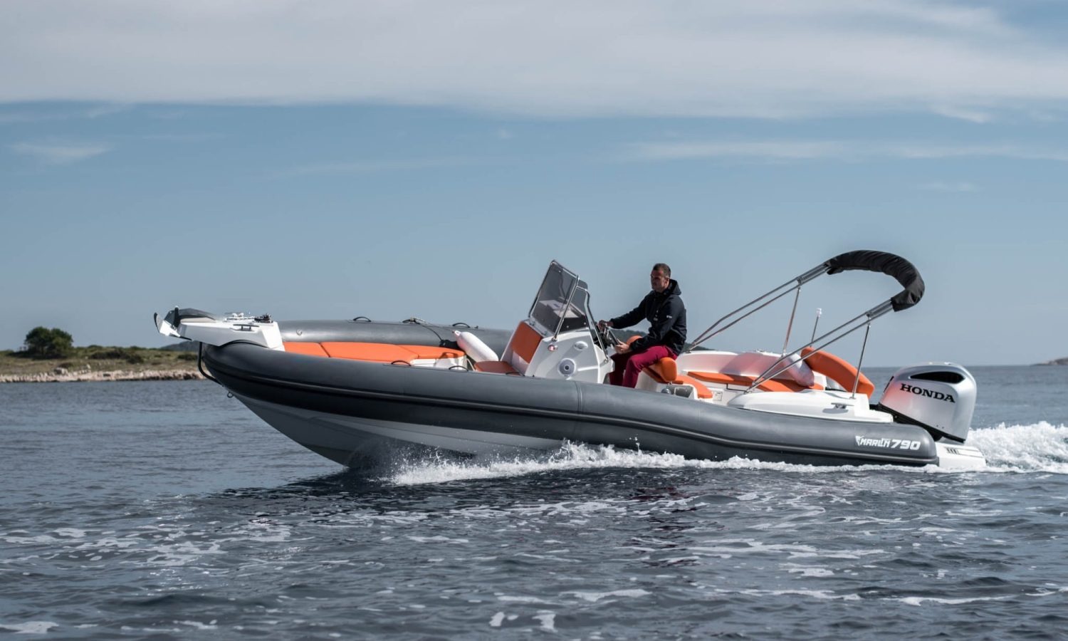 The Marlin 790 DYNAMIC is a superb, high-value Maxi RIB that offers a rare combination of superior volume and exhilarating performance. Capable of carrying 12 passengers and hitting speeds of up to 43 knots, this boat delivers reliable, dynamic handling that is both fast and economical, cruising efficiently at 25 knots.