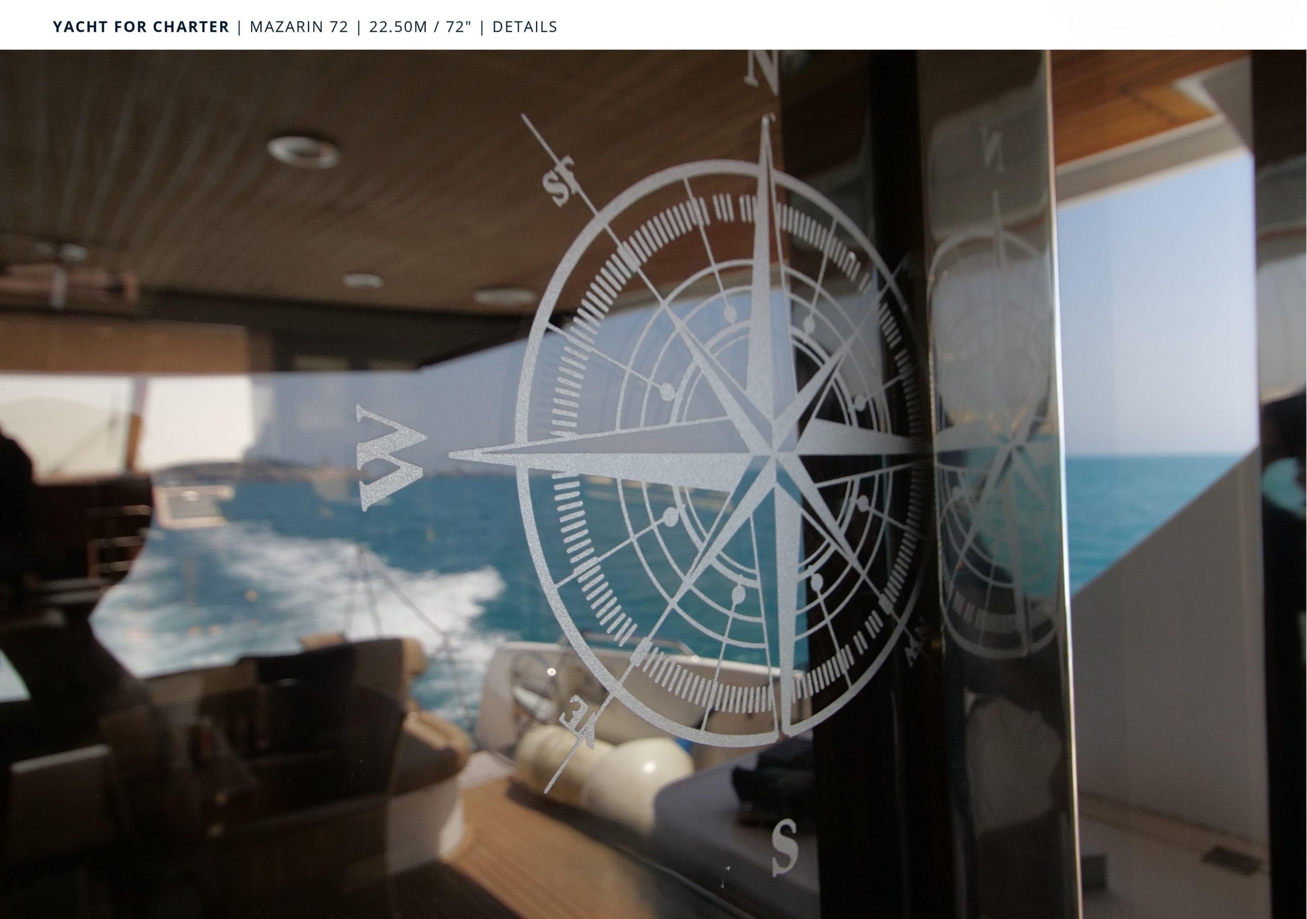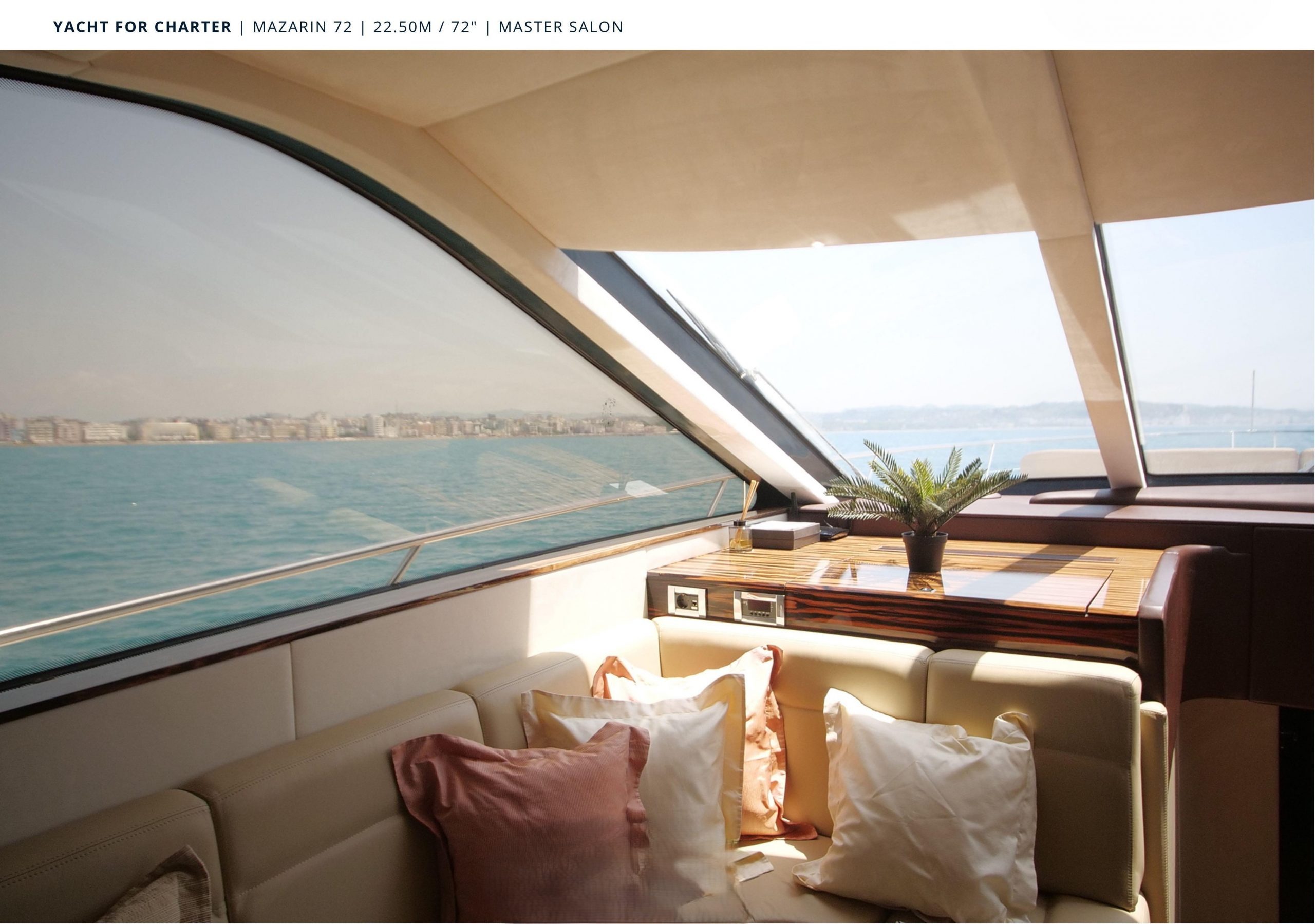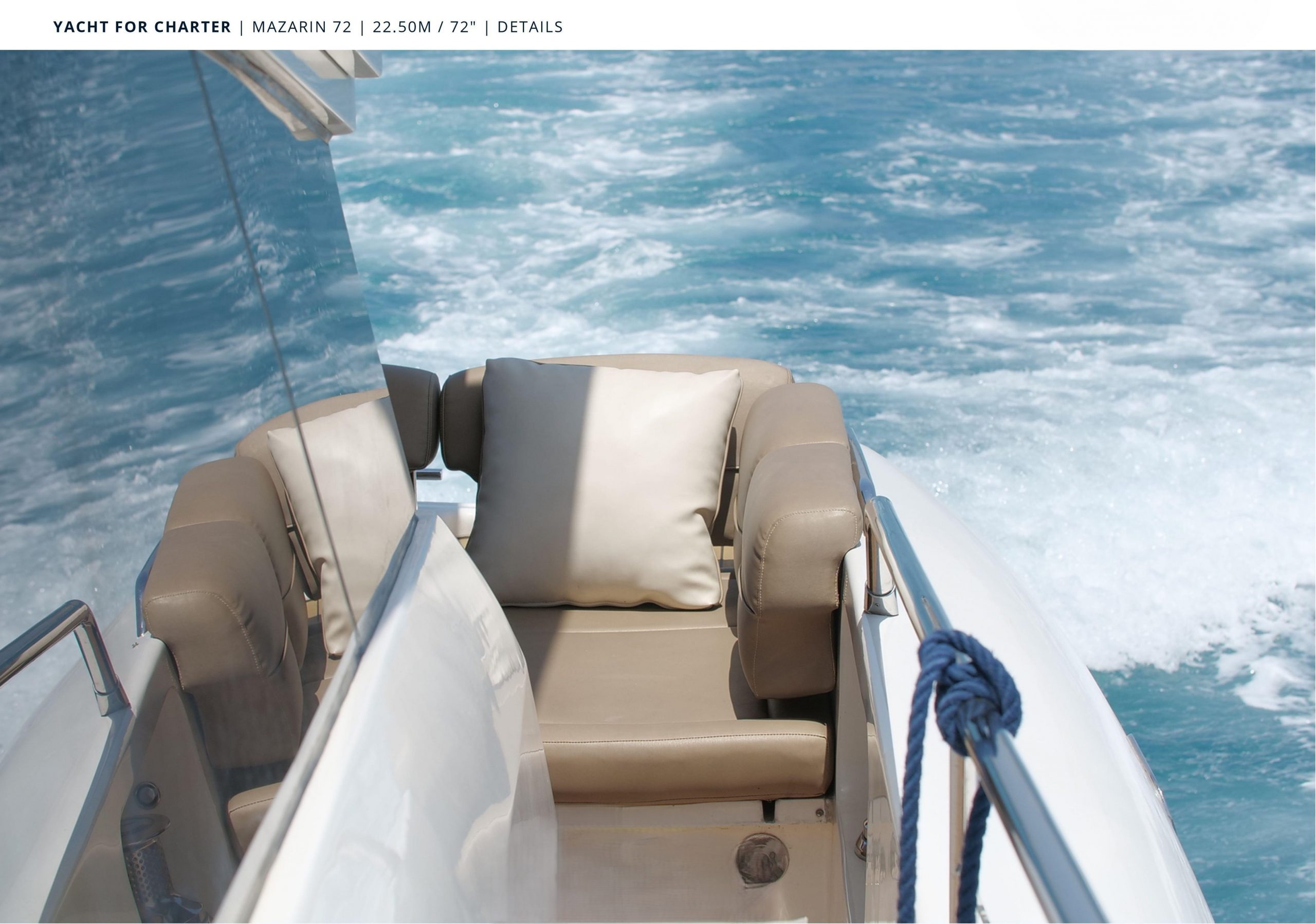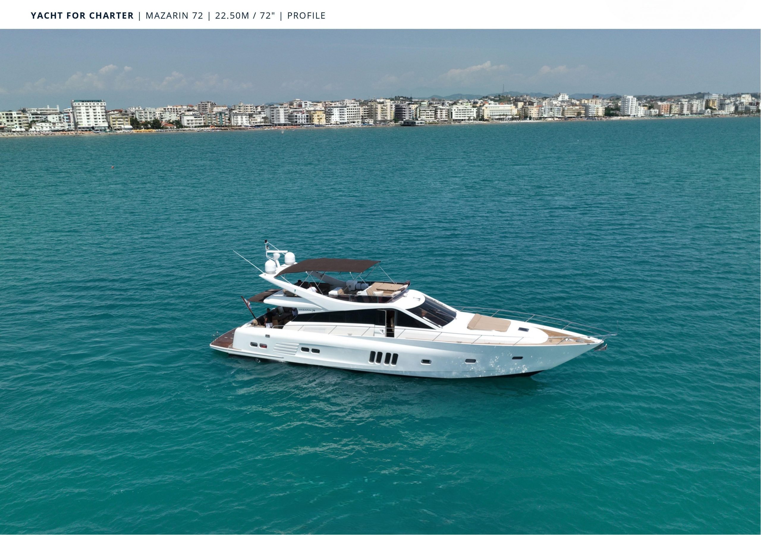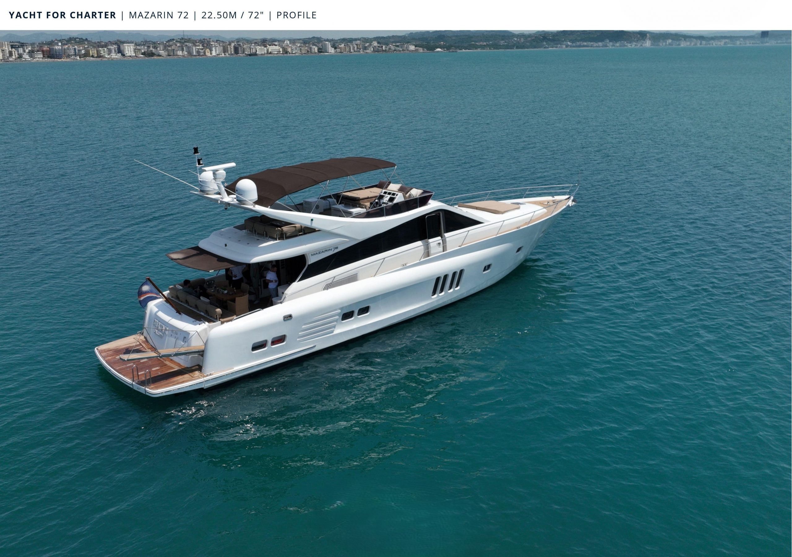 Hyni në bordin e Mazarin 72 elegante, një jaht i gjerë që ofron një ndërthurje perfekte të dizajnit të përjetshëm dhe komoditetit të jashtëzakonshëm. E ndërtuar në vitin 2008, kjo anije klasike është ideale për udhëtime të paharrueshme, me një ekuipazh të dedikuar gati për të pritur deri në 12 mysafirë që lundrojnë në ujërat mahnitëse të Shqipërisë dhe Korfuzit.