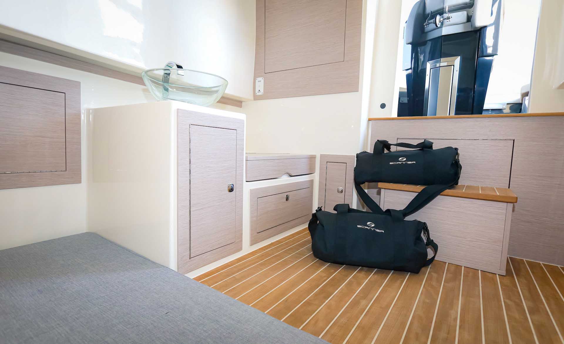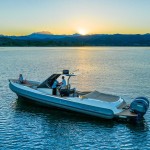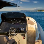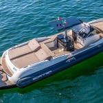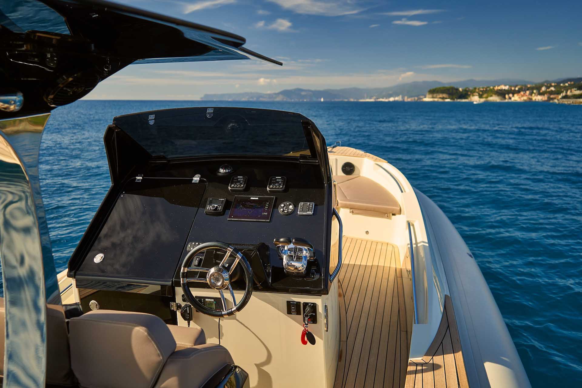 It is not just an outboard version but a style that is represented, different but similar flaunts an aggressive line that finds its proper connotation in the outboard version. A size that is not excessive but underdeck offers a toilet bed with adequate space, a T-top that protects the console and the center cabinet with two sunbathing areas.