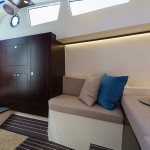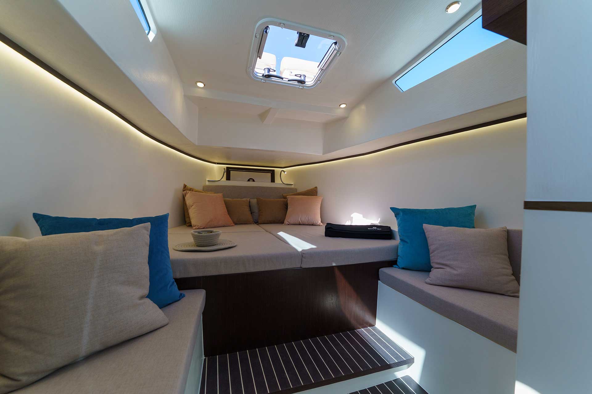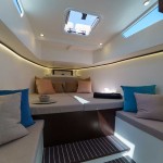 Mooring cleats, fiberglass bow, electric winch, cabin with interior fittings wooden , interior cabin cushions, bathroom with shower, sink and electric marine toilet, black water system with tank and macerator pump, center console with windshield and stainless steel handrail , Compass, Steering wheel, trumpet, Driver’s seat with stand-up cushion, Sink washbasin and cutting board, 70 lt refrigerator, Battery