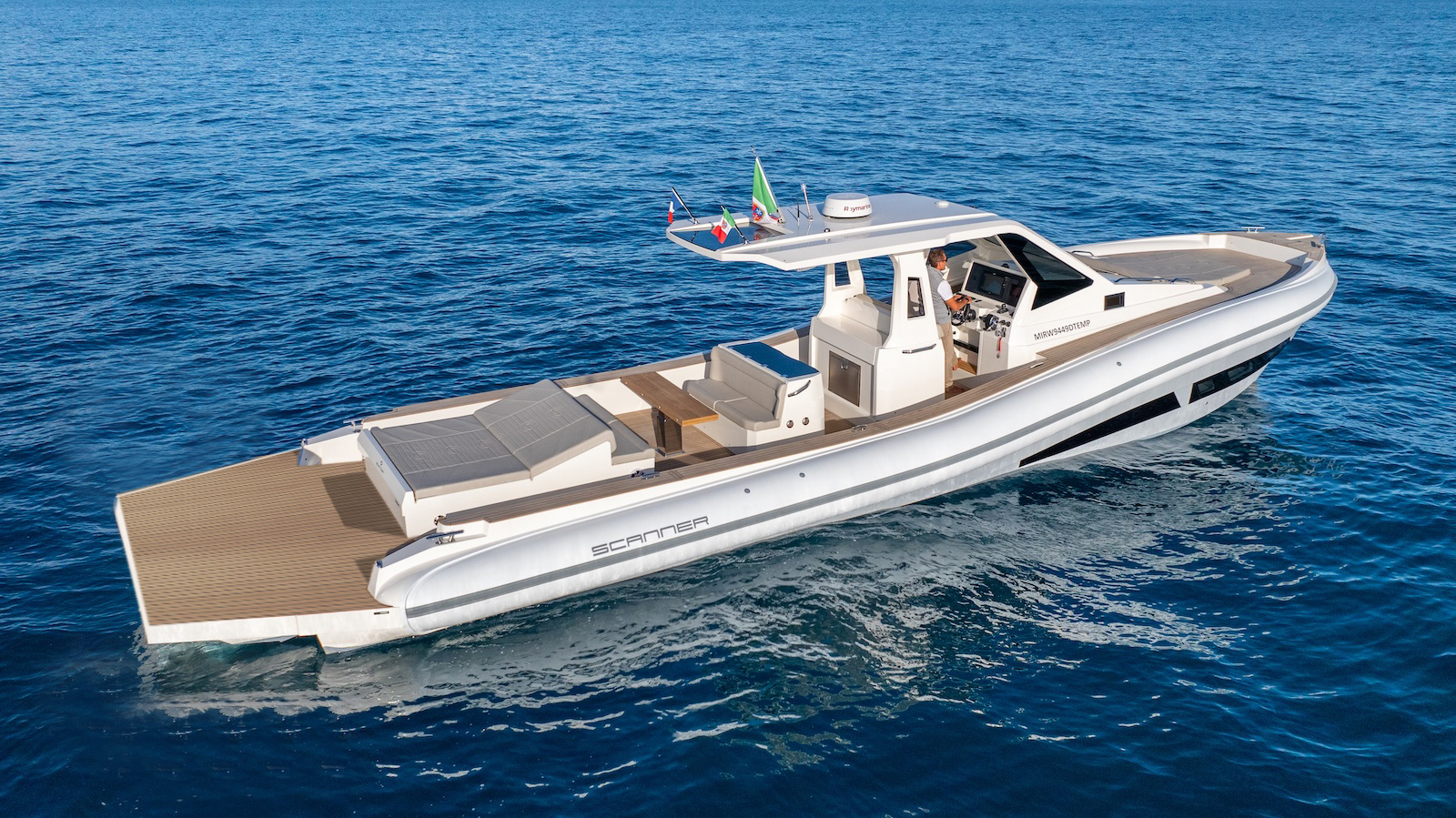 She is luxurious and refined, the new flagship of Scanner Marine. With 15.20 meters in length and a maximum beam of 4.40 meters, she is capable of satisfying all the desires of the discerning owners who have chosen her. The inboard version is characterized by its elegant lines and the presence of a stern beach free of all obstacles. New is the configuration of the deck, which, while remaining true to the family feeling of the line, fully espouses the walk-around concept and accommodates two as beautiful as they are functional side passages leading up to the large aft beach club. The bow of the Envy 1500 also goes up a level and gives this Maxi-Rib interior that in size and height is typical only of large motor yachts.