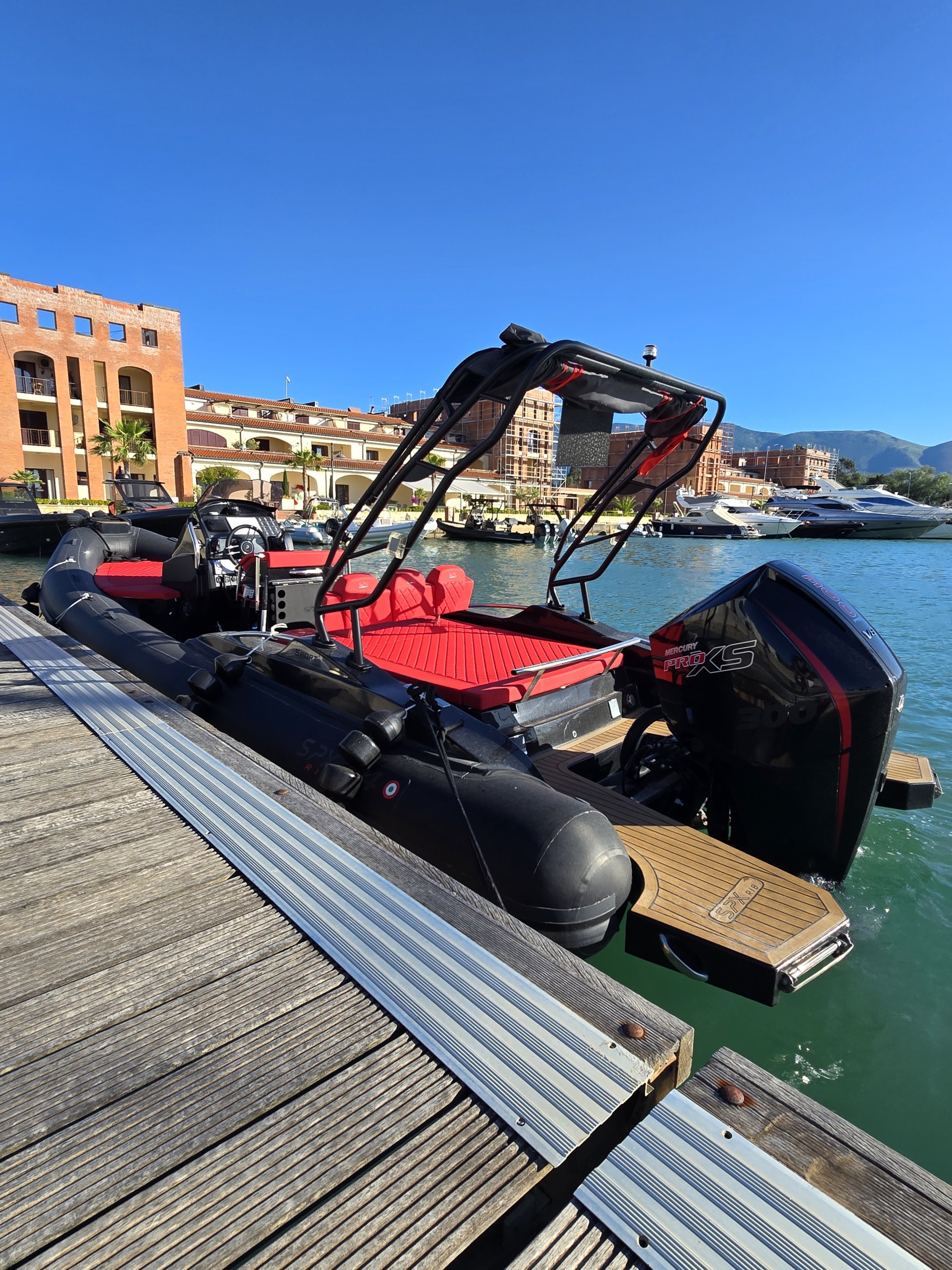 Feel the raw performance of a single 300 HP V8 Mercury Verado XS Pro engine, delivering breathtaking speed and precision handling. The striking black gel coat hull and carbon accents give it an aggressive yet sophisticated profile that is guaranteed to stand out from the crowd.