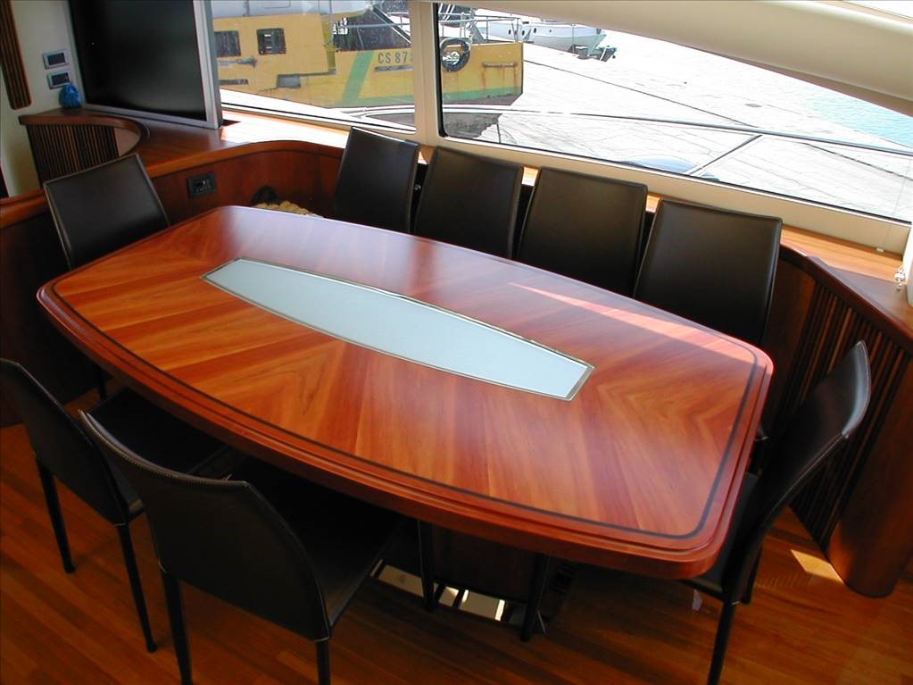 Engine alarm, Bilge alarm, Anchor, Water pump, Batteries, Teak side decks, Battery charger, Outdoor shower, Stern thruster, Bow thruster, Searchlight, Hydraulic trim tabs, Tender garage, Hard top, Fire extinguishing system, Courtesy lights, Gangway (IDRAULICA A SCOMPARSA), Platform (AFFONDABILE), Automatic bilge pump, Electric bilge pump, Manual bilge pump, Entrance door, Side door, Teak cockpit, 220V shore power socket, Electric windlass, Swimming ladder, Cockpit table, Handrails with gates, Horn, Stern winch.